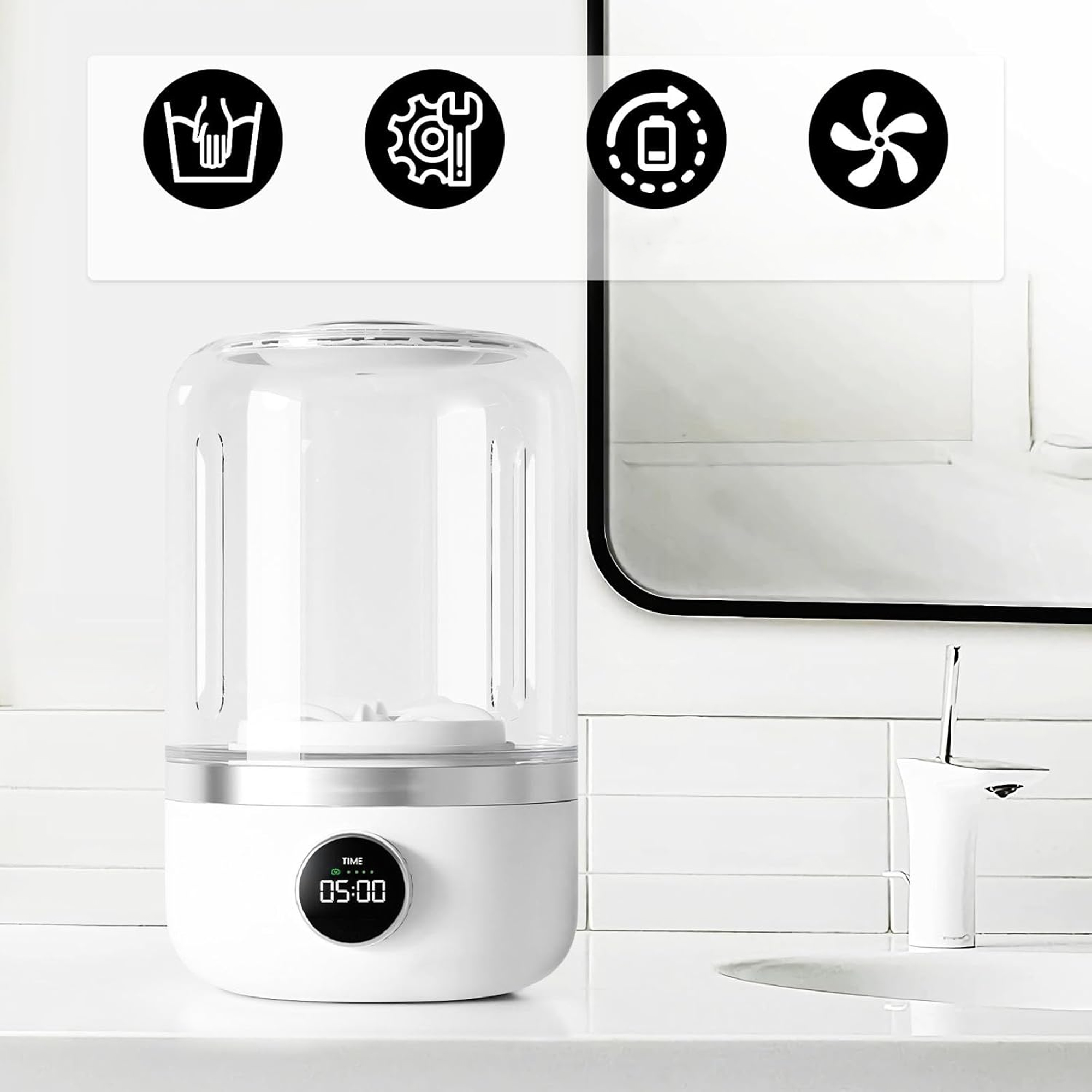 المميزات: خفيفة ومناسبة للسفر والتنقل سعة 1.2 لتر للملابس الصغيرة شاشة رقمية لضبط وقت الغسيل تنظيف ناعم وآمن للملابس الحساسة بطارية 4000mAh قابلة للشحن شحن سريع بمنفذ Type-C وضعين مختلفين للغسيل ـــــــــــــــــــــــــــــــــــــــــــــــــــــــــــــــــــــــــــــــــــــــــــــــــــــــــــــــــــــــــــــــــــــــــــــــــــــــــــ تفاصيل سريعة: الطاقة: 10 واط السعة: 1.2 لتر عدد الدورات بالوضع الأول: 36 دورة/180 دقيقة عدد الدورات بالوضع الثاني: 13 دورة/196 دقيقة البطارية: 4000mAh منفذ الشحن: Type-C الأبعاد: 13 × 13 × 21 سم الاستخدام: جوارب، ملابس داخلية، أطفال، مناشف صغيرة ـــــــــــــــــــــــــــــــــــــــــــــــــــــــــــــــــــــــــــــــــــــــــــــــــــــــــــــــــــــــــــــــــــــــــــــــــــــــــــ محتويات العبوة: غسالة محمولة صغيرة كابل شحن Type-C دليل الاستخدام ـــــــــــــــــــــــــــــــــــــــــــــــــــــــــــــــــــــــــــــــــــــــــــــــــــــــــــــــــــــــــــــــــــــــــــــــــــــــــــ كيفية الاستخدام: اشحن الجهاز بالكامل قبل الاستخدام اختَر وضع الغسيل من خلال الشاشة أضف الماء والمنظف والملابس اضغط زر التشغيل ودع الغسالة تعمل افرغ الماء ونظّف الجهاز بعد كل استخدام Golden Friday تفاصيل سريعة: الطاقة: 10 واط السعة: 1.2 لتر عدد الدورات بالوضع الأول: 36 دورة/180 دقيقة عدد الدورات بالوضع الثاني: 13 دورة/196 دقيقة البطارية: 4000mAh منفذ الشحن: Type-C الأبعاد: 13 × 13 × 21 سم الاستخدام: جوارب، ملابس داخلية، أطفال، مناشف صغيرة محتويات العبوة: غسالة محمولة صغيرة كابل شحن Type-C دليل الاستخدام