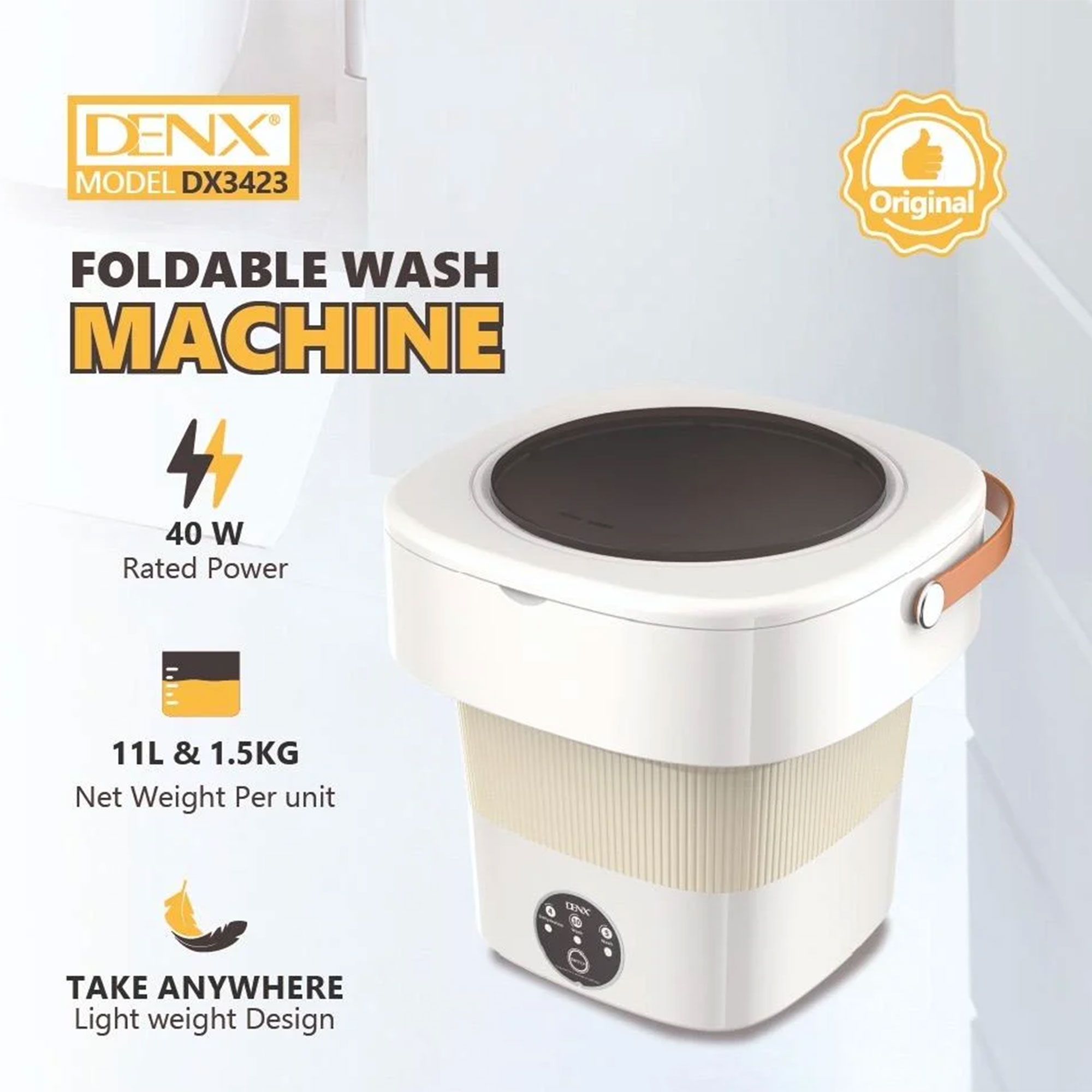 تصميم قابل للطي ما ياخذ مساحة وسهل التخزين. وزن خفيف 1.5 كجم، تنقلها معك وين ما تروح. سعة 11 لتر تكفي لغسيل الملابس اليومية. قوة تشغيل 40 واط تضمن توفير الكهرباء. لوحة تحكم بسيطة وسهلة لأي مستخدم. مناسبة لغسيل الملابس الخفيفة والأطفال. مثالية للسفر، الرحلات، والسكن الجامعي. مقبض جانبي لسهولة الحمل والنقل. آمنة ومصممة بجودة عالية ومواد قوية. ختم “أصلي” يضمن لك ثقة في المنتج. تفاصيل سريعة: الموديل: DENX DX3423 الضمان: عامين وكيل الضمان: دينيكس السعة: 11 لتر القوة: 40 واط الوزن: 1.5 كجم النوع: كهربائي اللون: رمادي × أزرق الاستخدام: غسيل خفيف وسريع القابلية للطي: نعم محتويات العبوة: 1 x آلة غسيل قابلة للطي 1 x دليل استخدام بريميوم الموديل: DENX DX3423 الضمان: عامين وكيل الضمان: دينيكس السعة: 11 لتر القوة: 40 واط الوزن: 1.5 كجم النوع: كهربائي اللون: رمادي × أزرق الاستخدام: غسيل خفيف وسريع القابلية للطي: نعم بريميوم